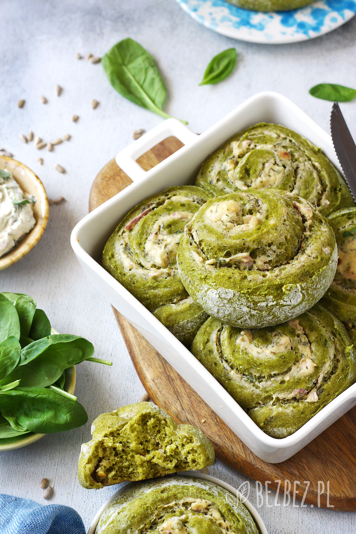 Bezglutenowe zawijaski szpinakowe to pyszne, puchate bułeczki, które świetnie sprawdzą się na przekąskę, domówkę lub letnie spotkania przy grillu. Zawinęłam je z aromatycznym czosnkowo-ziołowym nadzieniem, przygotowanym na bazie roślinnego „serka” do smarowania. Piękny zielony kolor bułek to zasługa szpinaku, którego nie czuć mocno w cieście, ale wizualnie robi robotę! Jest pysznie i w pełni „bezbez” – bez pszenicy, nabiału i jajek. Spróbujesz?